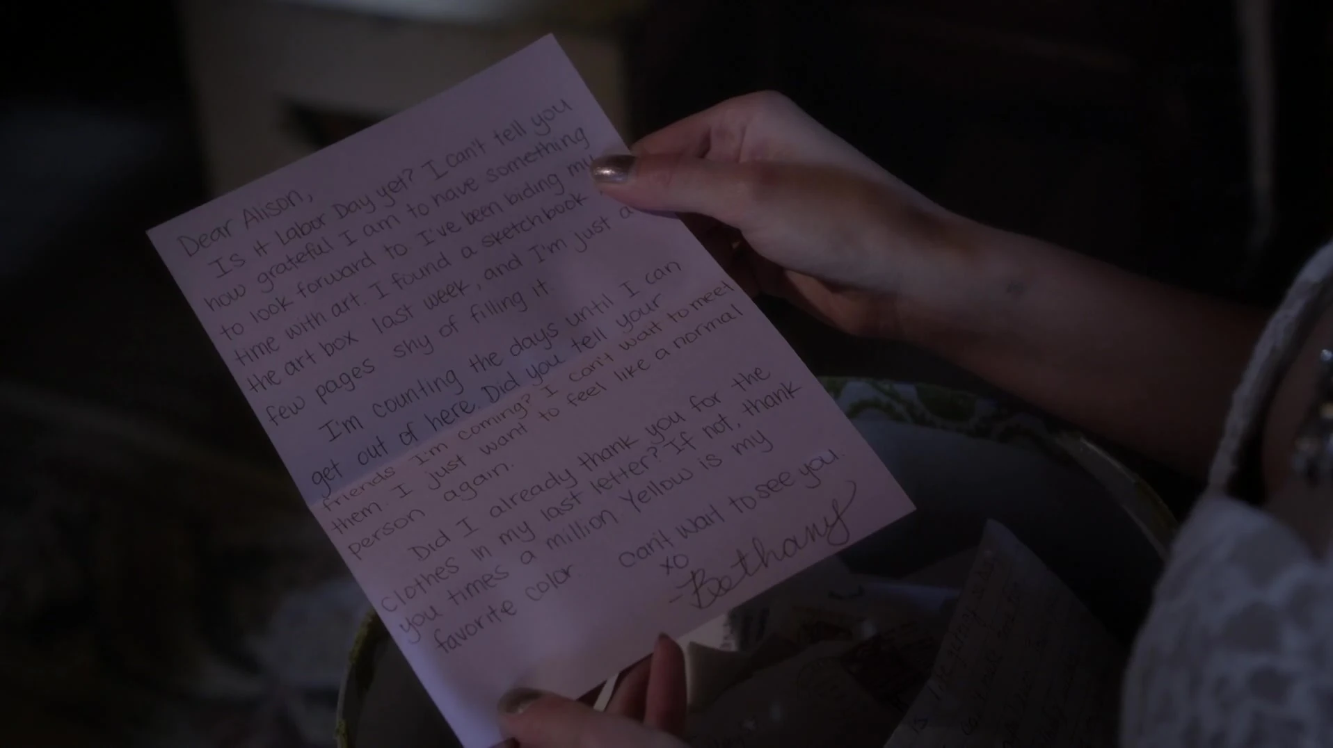 Dans l'épisode 13, Hanna fouille le grenier d'Alison et elle découvre une lettre que Bethany a écrite à cette dernière. Dans cette lettre, elle la remercie de lui avoir offert des vêtements, en précisant que le jaune est sa couleur préférée. Alison pourrait donc être la personne qui a envoyée la tunique jaune à Bethany. De plus, Bethany dit qu'elle a vraiment hâte de lui rendre visite le week-end de la Fête du Travail, c'est-à-dire le jour où elle a été assassinée. Nous apprendrons plus tard que cette lettre est un faux, écrit par "A" pour piéger Alison.
