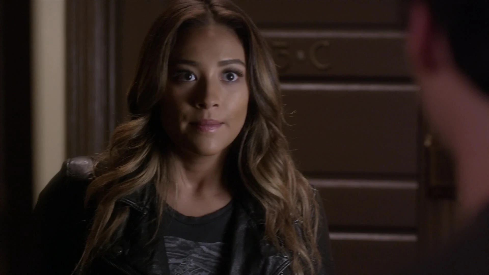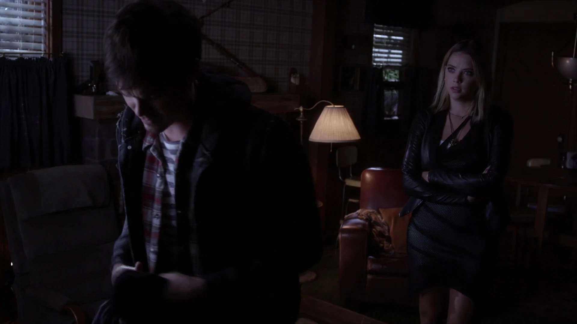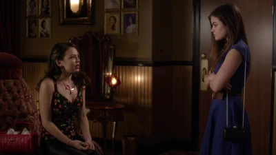 Au cinéma, un film en noir et blanc est en pleine projection. Aria se sent mal à l'aise de voir Mona à côté d'elle, en train d'enlacer Mike. Aria se penche vers Mona et lui chuchote quelque chose à l'oreille. Mona la regarde, l'air choquée, puis elle quitte la salle précipitamment, en prétendant revenir dans quelques instants.