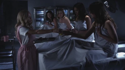 Aria, Emily, Hanna et Spencer se réveillent dans une pièce qui ressemble à une morgue, elles sont nues et recouvertes d'un drap des cadavres. Spencer se rend compte que "A" a probablement pris des photos pour envoyer à leurs familles afin qu'elles arrêtent de les chercher. Mona entre dans la pièce, vêtue d'une tenue d'infirmière avec un plateau d'aspirine et de jus de fruit pour les filles et elle agit de nouveau comme Alison. Elle informe les filles qu'elles ont été inconscientes pendant quelques heures. Une voix au haut-parleur leur dit d'aller dans leurs chambres, des "surprises" les attendent. Mona, dans un acte de défiance, refuse d'aller dans sa chambre. Mais quand trois carillons résonnent, Mona dit aux filles d'aller dans leurs chambres. Les autres se précipitent et exigent de savoir ce qui va arriver si elles ne reviennent pas à leurs chambres. Mona admet aux filles que si elles ne vont pas dans leurs chambres, "A" va les emmener dans "le trou". Les menteuses n'ont pas le choix que de retourner dans leur chambre. Les portes se ferment derrière elles, on entend les cris horrifiés des filles.