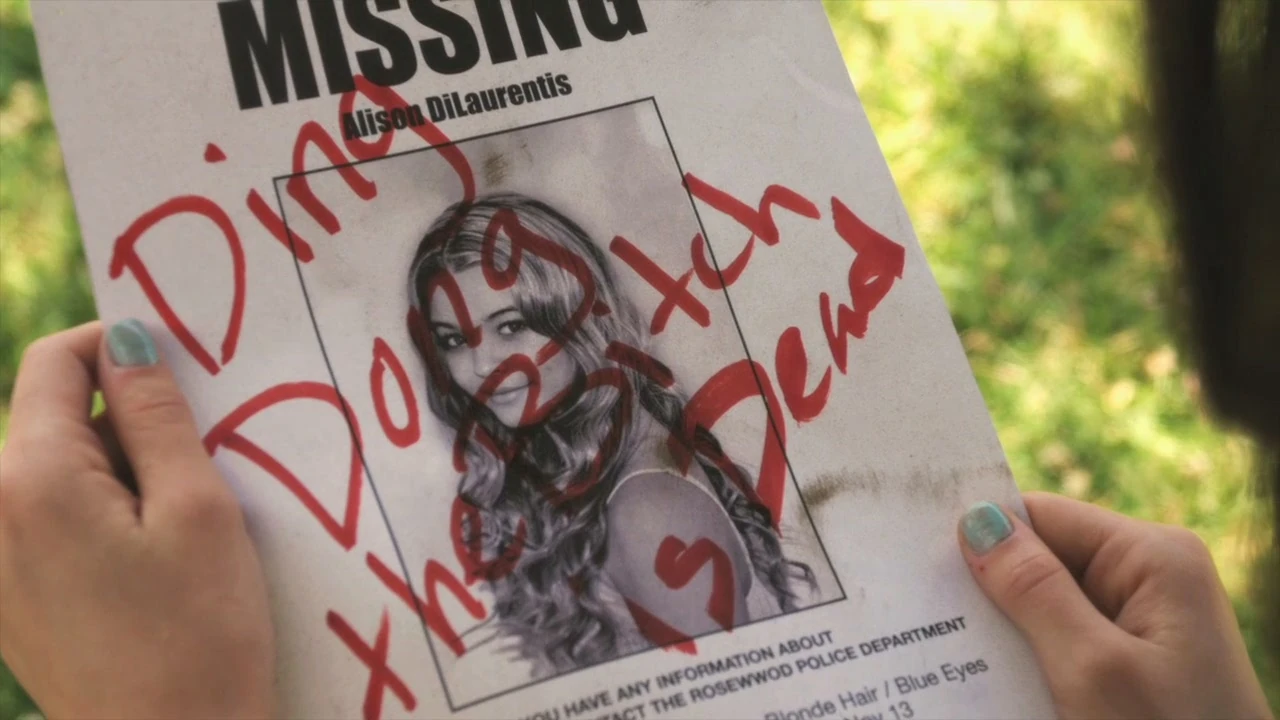 Après avoir abimé la voiture de Sean, la police vient chez Hanna et sa mère la prévient qu'elle ne veut plus jamais voir la police devant chez elles. Les filles se rendent au nouveau banc de Rosewood à la mémoire d'Alison. Spencer a l'idée de bloquer tous les emails et textos de tout les gens qu'elle ne connait pas. Les quatres filles font aussi. Les filles aprécient la vue quand M. Fitz passe en vélo en short. Aria est très gêné quand ses amies trouvent Ezra sexy. Juste après, une affiche de la disparition d'Alison vole et leur arrive entre les mains avec, écrit par "A", une remarque sur sa mort.