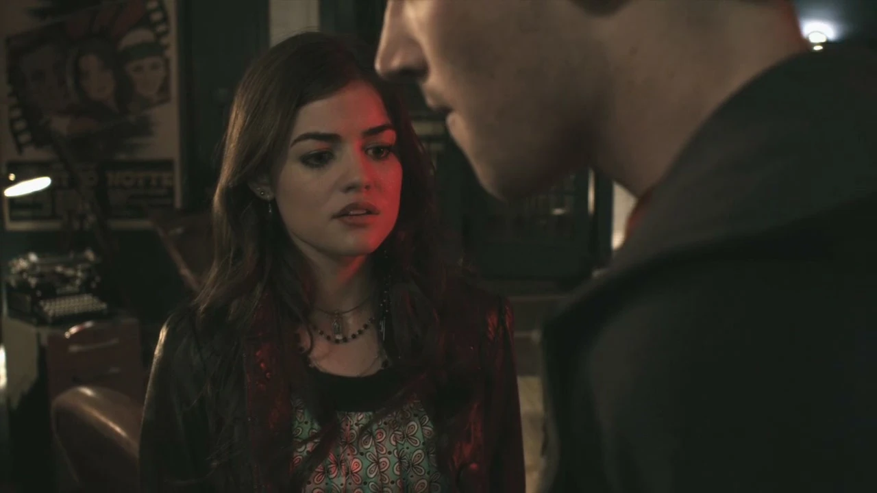 Aria arrive chez Ezra en colère pour lui dire qu'elle a jamais été autant mal a l'aise de toute sa vie et que c'est nul ce qu'il a fait. Elle lui reproche de vouloir lui donner des leçons et de porter des jugements sur ses parents alors qu'il ne sait rien de la situation. Ezra dis qu'elle a raison, et qu'il ne la connait pas. Il la fait entrer et ferme la porte.