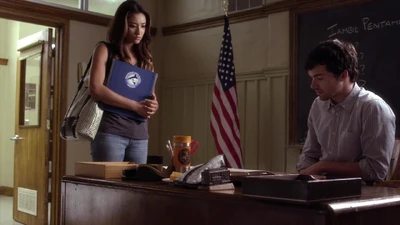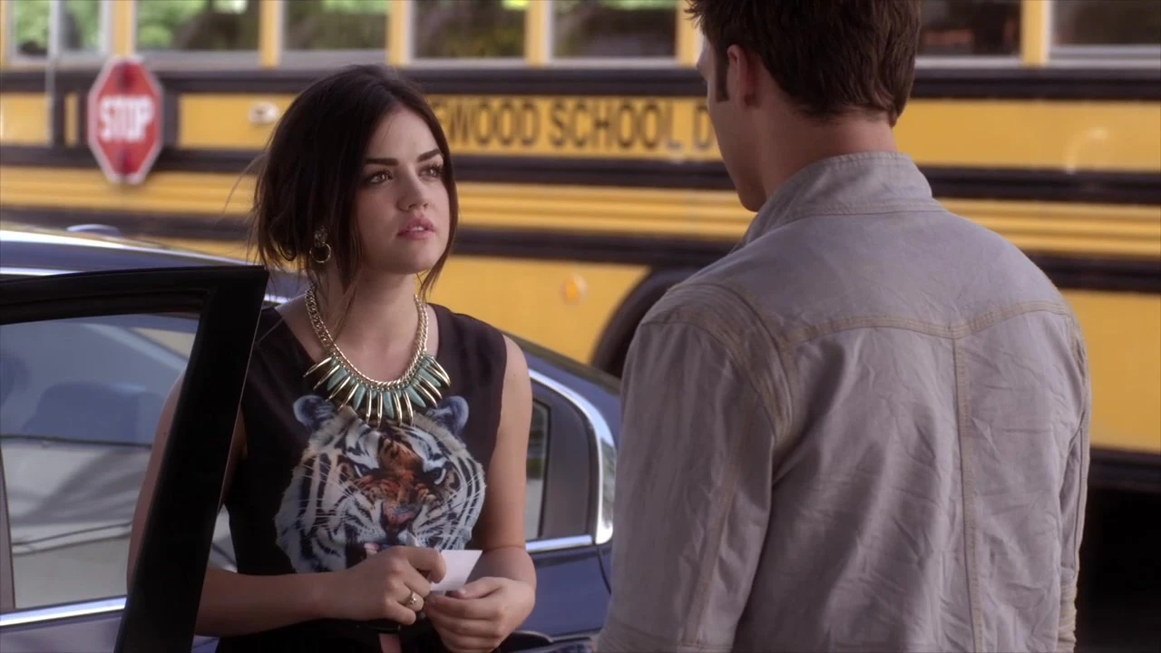 À l'intérieur du lycée, Emily parle avec Ezra, lui demandant si sa lettre de recommandation n'est trop élogieuse et si ça ne fait pas un peu trop. Malheureusement, Ezra n'est pas de très bonne humeur et dit à Emily qu'il y a des gens qui ont des problèmes réels. Il s'excuse alors et dit à Emily que Maggie et Malcom déménagent à l'autre bout du pays. Il demande également à Emily ne pas le dire à Aria, car il voudrait être le premier à lui dire.