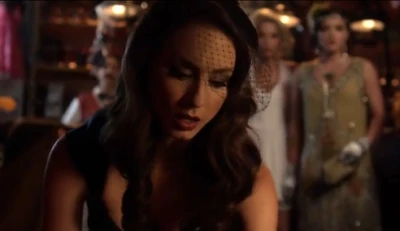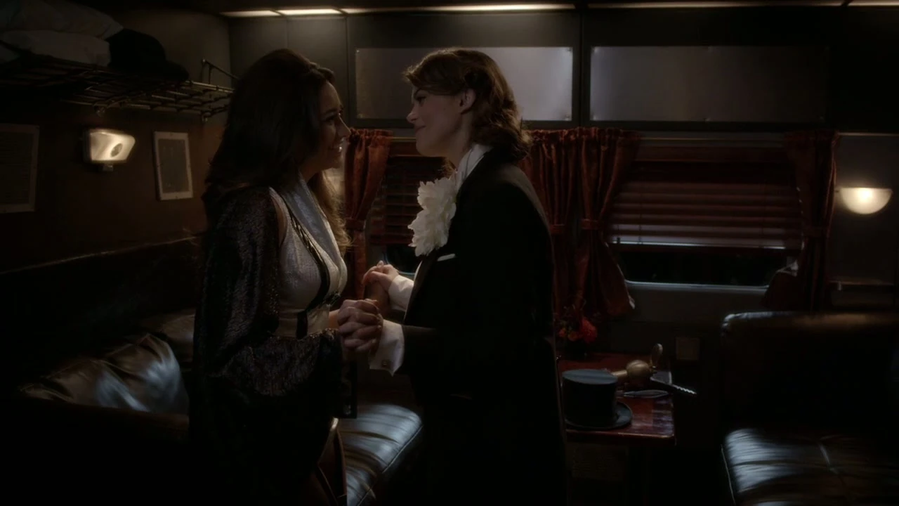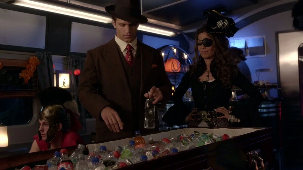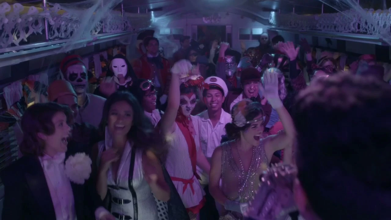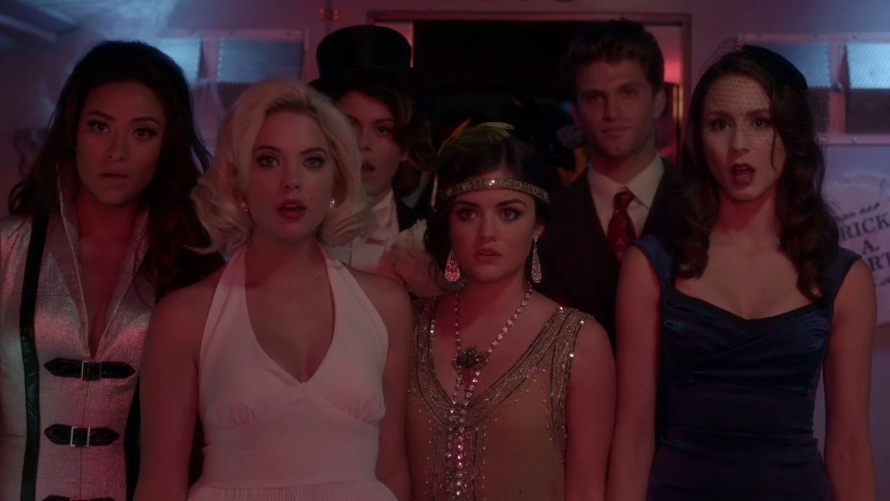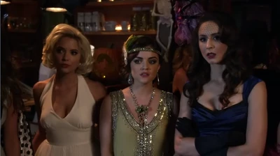 Au Brew, tout le monde est rassemblé en attendant le train. Lucas est habillé comme Jimmy Olsen, avec un appareil photo à l'ancienne. Lorsque qu'Hanna arrive en Marilyn Monroe, il la prend en photo, elle lui dit qu'elle veut passer incognito. Lucas lui dit qu'elle est belle. Aria est habillée comme Daisy Buchanan. Elle est rejoint par Hanna. Elle lui dit qu'Ezra ne viendra pas. Toby et Spencer arrivent avec des costumes de Humphrey Bogart et Lauren Bacall. Spencer va voir les filles. Noel Kahn et Jenna sont là, Jenna a un cache-œil de pirate. Noel leur parle du fait qu'il n'a pas organisé la fête cette année . Noel prend une cacahuète et s'étouffe avec. Spencer et Toby l'aident , ce qui ne l'empêche pas de s'étouffer. Un faux diable jaillit de sa poitrine et il rit avec Jenna, c'était une blague. Emily et Paige font leur entrée. Emily est Barbarella et Paige Marlene Dietrich. Hanna dit de Paige et Emily qu'elles ressemblent au couple sur le gâteau de mariage venant de l'espace. Jason arrive, son costume est celui de James Dean, Spencer n'a pas le temps de lui parler, car il est temps de monter à bord de la navette pour le train fantôme.